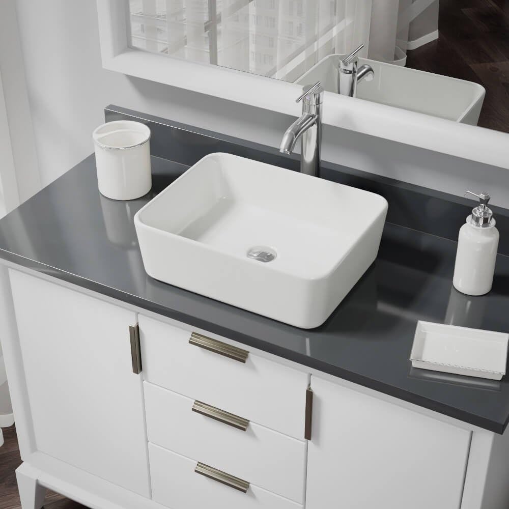 This attractive, biscuit-colored, porcelain basin is designed to be mounted atop the counter to display its natural beauty. Rectangular in shape, its vitreous china finish glistens with charm and durability. The R2-5007-B is constructed of solid porcelain but with a special additional enamel added at the end of its firing, turning it into a hardened, true, vitreous china. On its own, porcelain is both beautiful and durable, but the additional vitreous china coating creates an even more impervious and sanitary surface. It measures 19 1/8" x 14 3/4" x 5 1/4". The R9-7001-C is a tall, vessel-style faucet soundly constructed of premium-quality, solid brass components. Its design is cylindrical with a chrome finish and matching baseplate. Water temperature and pressure is controlled by the rod-style, swivel handle. Ceramic disc cartridges assure dependability. With a simple press to its handsome, chrome dome; the included, spring-loaded, vessel pop-up drain can be opened or closed.